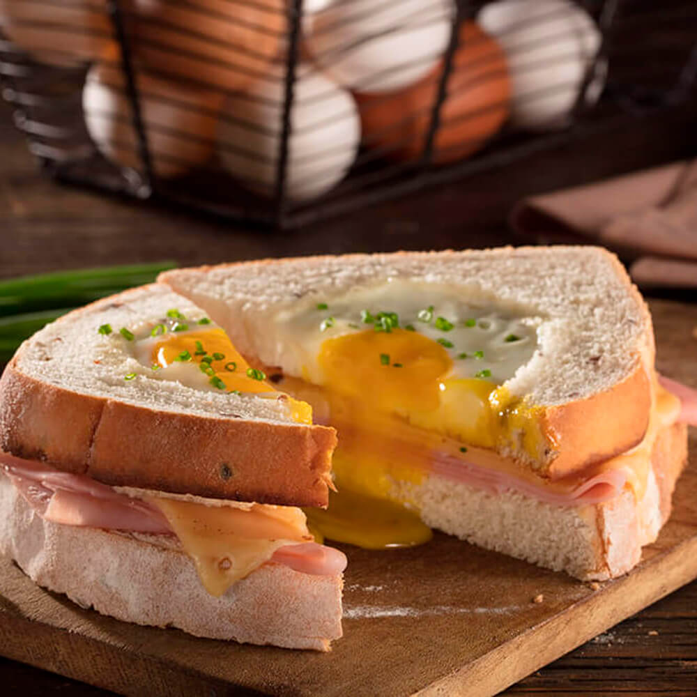 Derretir manteca en una sarten y colocar la rebanada perforada. Cocinar un huevo en el centro de esa rebanada.