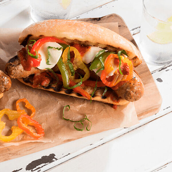 Tostar los Panes de Pancho Artesano en el grill u hornito y untarlo con la salsa roja picante, poner el chorizo en el medio y salsearlo con la salsa alioli. Para hacerlo más picante ponerle por encima rodajas de ají picante.