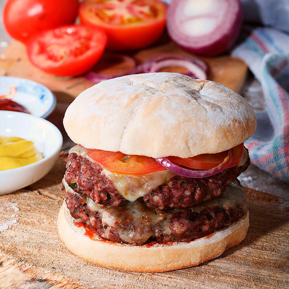 Abrir al medio un Pan de Hamburguesa Artesano. Colocar los dos medallones con queso y agregar rodajas de tomate y cebolla. Agregar la segunda tapa de Pan y ¡a disfrutar!