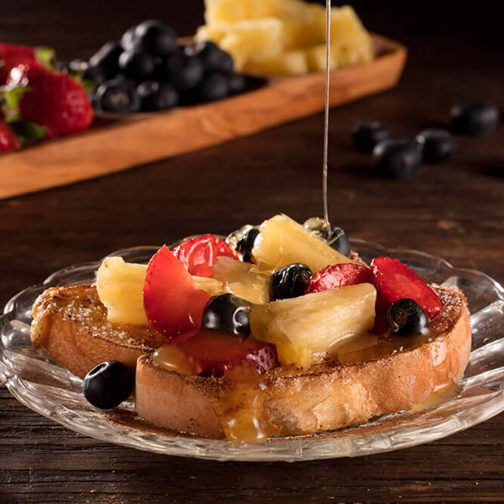 Agregarle azúcar, canela y luego las frutas cortadas (ananá, frutillas y arándanos).